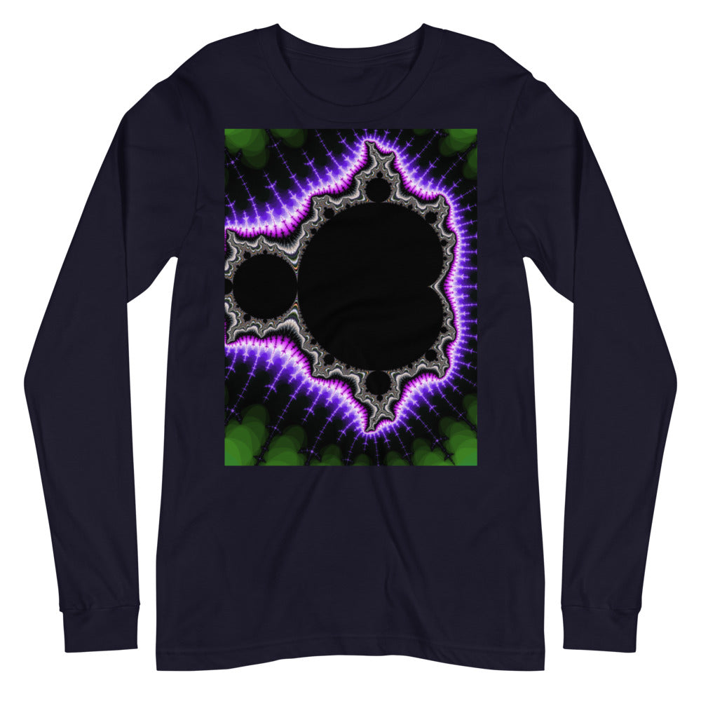 This design highlights the classic shape of the center of the Mandelbrot fractal. A brilliant purpleish white ring surrounds the fractal center with the excitement of an electric-zing!